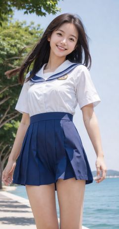 1girl, solo,from below,blue sky,smile,sailor suit,sailor  dress, shirt, looking at viewer,