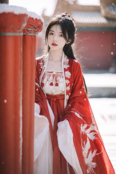 Blur, depth of field,arien_hanfu,1girl,red style,looking at viewer,sunlight, snow, hanfu,full body,  <lora:hanfu_dress3-000005:0.8>