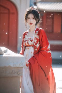 Blur, depth of field,arien_hanfu,1girl,red style,looking at viewer,sunlight, snow, hanfu,full body, lake,  <lora:hanfu_dress3-000005:0.8>