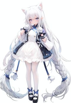 1girl, white_gloves, braid, full_body, gloves, long_hair, official_alternate_costume, pointy_ears, simple_background, solo, standing, very_long_hair, white_background,white hair,blue eyes,paw claw pose, open_mouth,