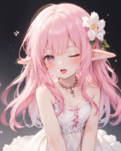 pink hair,eyes closed, pointy ears, long hair, hair flower, Lateral hair,elf,