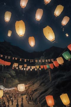 best quality,kongmingdeng in the sky, night, zhangdengjiecai, This photo is presented in a warm color tone, resembling the style of the famous photographer Steve McCurry. Under the tranquil night sky, the bright moonlight illuminates the scene where people are celebrating the festival. The close-up shot of the photo allows viewers to feel the enthusiasm and joy of releasing sky lanterns. In the sky, a graceful peacock soars, its feathers shining with colorful brilliance under the moonlight. People hold sky lanterns in their hands, smiling as they release them into the sky, creating a joyful atmosphere that permeates the entire image. Each person's posture is natural and genuine, exuding happiness and blessings. The surroundings are adorned with various decorations such as colorful lights and flower wreaths, adding to the festive ambiance. The use of depth of field makes the photo more three-dimensional, immersing viewers in the scene. Overall, this photo not only showcases the festivity of the holiday but also provides visual enjoyment through the imitation of Steve McCurry's style.