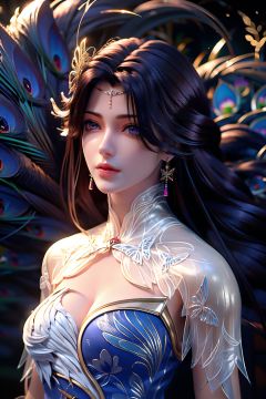 Best Quality, masterpiece, ultra-high resolution, (photo realistic: 1.4) , Surrealism, Fantastical verisimilitude, beautiful blue-skinned goddess Phoenix Peacock on her head, fantastical creation, thriller color scheme, surrealism, abstract, psychedelic, 1 girl,flower,castle,jyy-hd,1 girl,mds-hd,xwhd,yx-hd