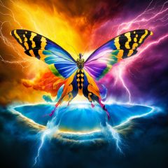 A thunder Colorful Butterfly formed by lightning dances in the disk,intricate details, explosion, chaos, lightning, debris, 8k, hyper detailed, magical and epic, epic light, concept and film art, t-shirt design, the most perfect and beautiful image ever created. Image taken with the Sony A7SIII camera. 8k photo cinematic, cinematic, photo, typography,Splash