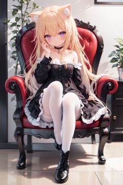 masterpiece, ((best quality)),  dynamic angle, chromatic aberration, ((colorful)),1girl, animal ears, dress, tail, solo, long hair, pantyhose, purple eyes, cat ears, cat, cat girl, cat tail, black dress, white pantyhose, standing, indoors, black footwear, animal ear fluff, looking at viewer, flower, off shoulder, full body, frilled dress, brown hair, long sleeves, blush, bangs, plant, choker, bare shoulders, potted plant, wooden floor, black choker, frills, boots, parted lips, very long hair, animal, blonde hair, chair, bow, collarbone, puffy sleeves, hair between eyes, shoes, black collar