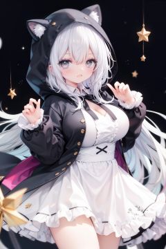 masterpiece, ((best quality)),  dynamic angle, chromatic aberration, ((colorful)),1girl, solo, hood, animal hood, breasts, frills, smile, hood up, yellow eyes, capelet, hair between eyes, blush, dress, long sleeves, looking at viewer, animal ears, large breasts, black ribbon, bangs, puffy long sleeves, :d, frilled dress, hand up, open mouth, white dress, puffy sleeves, hooded capelet, virtual *******r, frilled capelet, fang, white capelet, star (symbol)