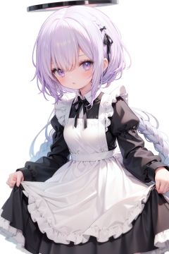 1girl,  solo,  apron,  long hair,  hair over one eye,  white background,  frills,  braid,  halo,  long sleeves,  dress,  simple background,  white hair,  white apron,  puffy sleeves,  very long hair,  frilled apron,  maid,  purple eyes,  ribbon,  parted lips,  maid apron,  bangs,  juliet sleeves,  black dress,  neck ribbon,  looking at viewer,  single braid,  blush