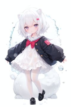 cute,Infant,solo blue shirt,blue sailor coat,loli,full body,white hair,snow leopard ear,white background,pink eyes,laugh,happy,white pantihose,white pantyhose,red armband,
