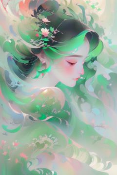 masterpiece,best quality,ultra-detailed,Ink wash painting,hyperdetailed painting,dynamic pose,1girl swimming in deep water,(see-through colorful cloth:1),(portrait:1.1),pretty face,((extremely delicate and beautiful girls)),dynamic angle,(beautiful detailed eyes),(detailed light),glowing eyes,ruby right eye,enchanting eyes,ruby left eye,(sunlight),(detailed glow),(fractal art:1.1),( chiaroscuro,Fujicolor, UHD, super detail ,raw,85mm,f/1.2,FujifilmXT4,),(green theme:1.5),