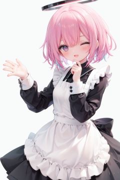 1girl, solo, apron, halo, hair over one eye, closed eyes, smile, white background, dress, white apron, simple background, long sleeves, multicolored hair, braid, open mouth, blue hair, alternate costume, blush, bangs, :d, pink hair, black dress, ribbon, frilled dress, enmaided, short hair, hand up, colored inner hair