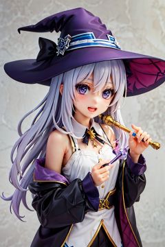 1girl, solo, hat, witch hat, elaina \(majo no tabitabi\), long hair, black headwear, looking at viewer, holding, shirt, purple eyes, heart, open mouth, wand, hair between eyes, bangs, upper body, robe, white shirt, black robe, star \(symbol\), bow, off shoulder, collared shirt, long sleeves, holding wand, open robe, sleeveless shirt, signature, bare shoulders