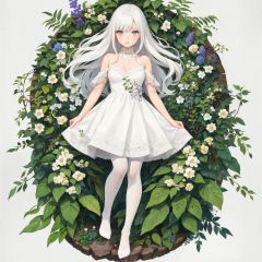 white pantyhose,no shoes, watercolor, masterpiece, best quality, extremely detailed, 1girl, full body, beautiful detailed eyes, cute anime face, full body, beautiful detailed face, white hair, (Botanical illustration:1.5), white dress,