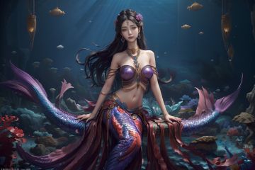 best quality,masterpiece,colorful,dynamic angle,highest detailedLong black hair, blue-purple mixed color,(half-body:1.3),mermaid,clearance,the space between a woman's breaks,eye,neck cover,ear pendants,bellyband,navel,sit,(orthographic lens:1.3),(watching the audience:1.2),neck ornament,clear water,seabed,rock,