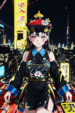 ((masterpiece)),((best quality)),8k,high detailed,ultra-detailed,upper body,((huangfu pape on head)),1girl,jiangshigirl costume,breast,bare shoulder,painted face,makeup,<lora:QDjiangshi:0.75>,((Urban Temptation)),((city rooftop)),(half-body portrait),(provocative),(urban setting),(skyscrapers),(neon lights),(floating pose),(motion trails),Pop mart style and neon lights surround the tempting Jiangshi in a half-body portrait on a city rooftop. The floating pose and motion trails add to the dynamic urban atmosphere,<lora:coloricher:0.5>,