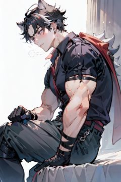Wriothesley,animal ears,black hair,white hair,purple eyes, streaked hair, <lora:Wriothesley:1>,<lora:修手neg4all_bdsqlsz_V3.5:1>, masterpiece,best quality,male focus,(manly),masculine appeal, handsome face,finely detailed eyes and face, youthful face,(solo),(alone),detailed eyes, Perfect features,(20-year-old male),narrow waist,1boy,police, 1boy, male focus, police uniform, muscular, solo, uniform, muscular male, pants, bara, hat, police hat, large pectorals, pectorals, tight, gloves, veins, shirt, manly, tight shirt, belt, thick arms, taut clothes,black shirt, taut shirt, short hair, thighs, thick thighs, black gloves, veiny arms, biceps, black belt, collared shirt, closed mouth