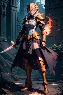 (masterpiece, top quality, best quality, official art, beautiful and aesthetic:1.2),(8k, best quality, masterpiece:1.2),CGDivineSwordsw, weapon, sword, armor, holding, holding weapon, holding sword, solo, helmet, 1gril, full armor, shoulder armor, standing, pauldrons, glowing, embers, Female focus, gauntlets, fire, breastplate, flaming weapon, glowing weapon, flaming sword, knight, full body, yellow glow, orange grow,fantasy,Princess