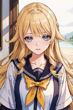1 mature woman,athlete,high quality, masterpiece, 1girl, beautiful, cute face, very long hair, (school uniform,sefuku),blond_hair,wavy_hair,eyeshadow, ,Navia \(genshin impact\),backlight,bow on chest