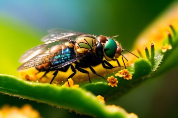 (macro photography:1.2), (cinematic and dynamic:1.3), Step into the miniature world with a super close-up macro shot of a fly resting on a colorful flower. The high contrast and cinematic lighting accentuate the photo-realistic details, while the super vibrant colors against a cinematic background create a visually engaging scene, perfect for a short cinematic adventure that magnifies the beauty of nature.