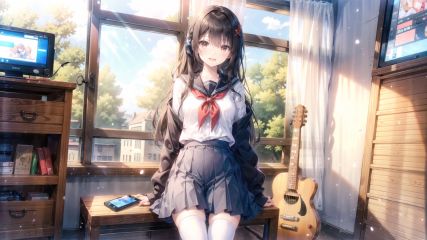 1girl, solo, Sitting, sitting_down, smile, , illustration, masterpiece, best quality, beautiful face, young girl, long_hair, black_hair, detailed eyes, red eyes, (upper body), cowboy shot, clear room, (guitar case), (headphones, tablet pc), ((computer, game console, box, chair, toy)), ((Play electric guitar)), (baggy clothes:1.4), light through window, (full body), , , , white thighhighs , hikaru_r_gohouka, <lora:EMS-37562-EMS:0.500000>