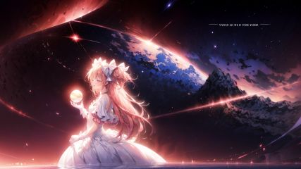 1girl, (ultimate madoka, solo,  pink hair),  long hair,  gloves,  dress,  two side up, (wide shot,  panorama,  distant view),  blonde practicle,  closed eyes,  holy light,  (from side),  [English text],  (in the universe,  planets), <lora:EMS-6907-EMS:1.000000>, , <lora:EMS-484-EMS:0.700000>, , <lora:EMS-1495-EMS:0.600000>