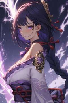 (masterpiece:1.2), best quality,pixiv, 1girl, solo, raiden shogun, purple eyes, long hair, japanese clothes, breasts, looking at viewer, braid, kimono, purple hair, sash, hair ornament, cleavage, bangs, jewelry, earrings, obi, purple lightning, mole, braided ponytail, purple kimono, vision (genshin impact), upper body, mole under eye, closed mouth, tassel, off shoulder, large breasts, shoulder armor, very long hair, long sleeves, red ribbon, ribbon, armor, from side <lora:Niji 动漫模型优化器_v3.0:1>