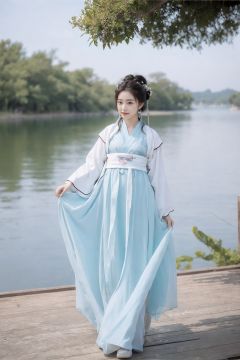 arien_hanfu,1girl,full body,tree,lake background,sky hanfu <lora:arien_blue_dress_02:0.6>
