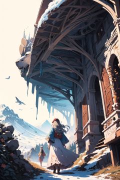 masterpiece, best quality,ultra-detailed,ultra high res,1girl,bohemian style, flowing dresses, layered clothing, earthy colors, fringe accessories, ethnic prints, natural fabrics, BREAK,artistic designs, snowmountain, cinematic, shot from below,(illustration by Mattias Adolfsson,full frame:1.5)