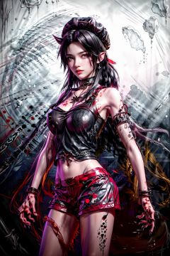(((best))),8k,UHD,((masterpiece)),bright ,high quality,realistic,solo,Colored lead painting,1girl,beret,string,revolver,bare legs,greyscale,snow background,shorts,t-shirt,fang,aqua eyes,(glowing eyes),(splatter background),horns,Chest,leihua,jyy-hd,mds-hd