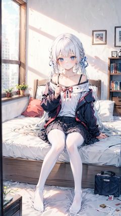bed,1girl,computer,on_bed,off_shoulder,clock,book,laptop,indoors,pillow,solo,jacket,calendar_\(object\),photo_\(object\),bed_sheet,white_legwear,picture_frame,skirt,sitting,bookshelf,speaker,long_hair,