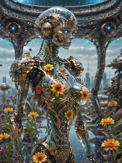 young glass sentient organic alien robot octopus walking on glass spaceship bridge, clear glass future fantasy concept, a glass city, epic scale, future, detailed sentient organic flowers linked together inside glass to form body, year 3000, sci fi, glass space ships floating by, amazing fine close overwhelmingly detailed, galaxy over plants atmosphere, (detailed flower robot face), clear depth of field, vignette, highly detailed, high budget, bokeh, cinemascope, epic, gorgeous, film grain, grainy . magnificent, celestial, ethereal, painterly, epic, majestic, magical, fantasy art, cover art, crouds of people walking, (((distant view from low orbit))), pictograph, dust_particles,DonMCyb3rN3cr0XL ,Clear Glass Skin with metal flowers inside