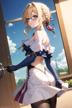 masterpiece, best quality, 1girl, anzhcvioletevergarden, blue off-the-shoulder top, plaid, chevron, studded, backless, teardrop-framed glasses <lora:AnzhcVioletEvergarden CAME class_200312:1>
