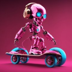 (a Detailed Hip Hop pink Robot woman skateboarding down the street in a fantasy world,Skull Head, blue eyes)