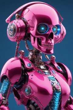 (a Detailed Hip Hop pink Robot woman rollerskates down the street in a fantasy world,Skull Head, blue eyes, Detailed robotic rollerskates)