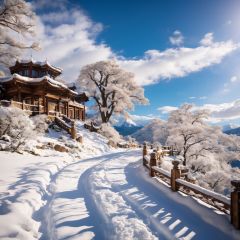 landscape, no people, architecture, outdoors, trees, clouds, snow, steps, blue sky, mountains, rocks,super fine, ultra high definition