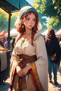 a girl,gypsy girl,wandering,complicated old clothes,(natural colors, correct white balance, color correction, dehaze,clarity),RAW photo,full sharp,wallpapper 8k uhd,dslr,soft lighting,high quality,Fujifilm XT3,european,red hair,outdoor,noisy street,a small pointed nose,at the flea market,many people gathered,beautiful,tall slim,sexy,in france,dark tone,movie screen,magazine,dressed in bohemian handmade traditional costumes,the beige lace headscarf tied up the hair,head wearing a beautiful flower,standing in the shadows,strong light and dark contrast,the body has a complicated handmade ornament necklace bracelet,long necklace with big decorations,