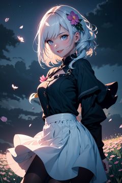 masterpiece, best quality, 1girl, (colorful),(delicate eyes and face), volumatic light, ray tracing, bust shot ,extremely detailed CG unity 8k wallpaper,solo,smile,intricate skirt,((flying petal)),(Flowery meadow) sky, cloudy_sky, moonlight, moon, night, (dark theme:1.3), light, fantasy, windy, magic sparks, dark castle,white hair