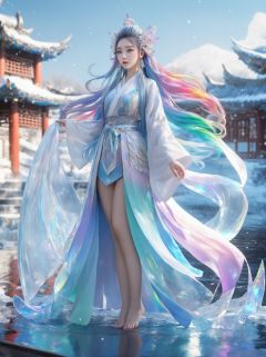 1girl,solo,outdoors,masterpiece,best quality,huge bust,chest focus,long_hair,korean idol,kaza,loose_necktie,beautiful detailed glow,detailed ice,beautiful detailed water,(floating palaces:1.2),(ice crystal texture wings),(Iridescence and rainbow hair:2.5),hanfu, tang style outfits,<lora:hanfuTang_v32:0.7>,full_shot,upshorts,colorful,huge filesize,adorable_girl,