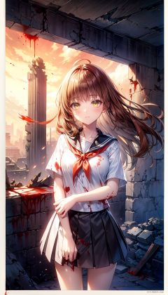 (black greyscale:1.2),(best quality),original,Perfect details,(ultra-detailed),illustration,(fantasy:1.1),(clear frame:1.1),(extremely detailed CG unity 8k wallpaper),(depth of field:0.66),(Livy Irwin),(cowboy shot:1.2333),(1girl:1.314),(orange eyes:1.314),(dark brown hair:1.314),(blunt bangs:1.233),absurdly long hair,(blood in eyes:1.3),(stain blood on face:1.35),(blood adorns hair:1.2),(red haori,white Sailor suit:1.14,black Pleated skirt),(loafers),(closed mouth),(world tree),(ruins:1.233)<broken>,wind,Flying ashes,Flying flame,(Twilight light:1.21),Infernal,(floating ashes),,(yubao:0.5)