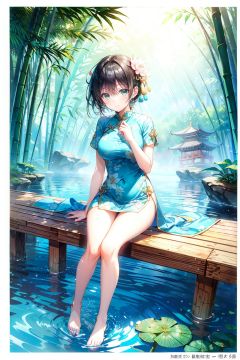 (sunlight, beautiful sky, floating hair, Fisheye lens lens, dynamic angle, distant view, panorama ,overlook,barefoot), ((Ancient_Chinese_architecture)), (short sleeves),with a combination of Morgan colors, Qiu Ying's painting style, And high end color matching, ((A beautiful girl sitting on a bamboo raft in the water, swimming downstream, Huge lotus, rain, (full body), aqua_china_dress)), (bright light,fantasy), ((spotted light)),1 girl, ((black hair, shy, blush))