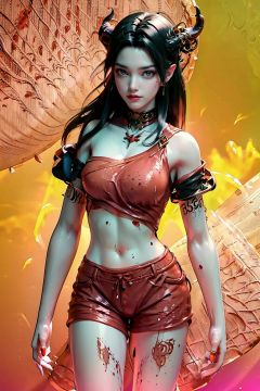 (((best))),8k,UHD,((masterpiece)),bright ,high quality,realistic,solo,Colored lead painting,red style,1girl,beret,string,revolver,bare legs,greyscale,snow background,shorts,t-shirt,fang,aqua eyes,(glowing eyes),(splatter background),horns,Chest,leihua,jyy-hd,mds-hd,greendesign,sssr,hand101