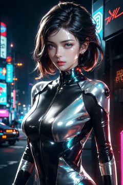 (dramatic, gritty, intense:1.4),Posters,masterpiece, best quality, 8k, insane details, intricate details, Sexy Girl, hyperdetailed, hyper quality, high detail, ultra detailed, Masterpiece, science fiction,(cyberpunk:1.3),building,1girl, solo,Patent leather,bodysuit,glowing,shiny,(shiny skin:1.7),(long legs:1.3), (Slim body:1.1), (upper body:1.2)