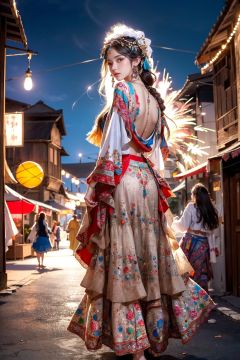 Fisheyes,masterpiece,top quality,best quality,official art,beautiful and aesthetic,a bustling street,the atmosphere of the festival,fireworks,1 girl,wanjia lights,blooming,(Bohemian_printed_top:1.4),(Flowy_maxi_skirt:1.3),(Layered_necklaces:1.2),looking back,
