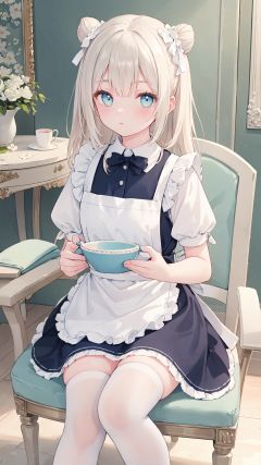 1girl, solo, sitting, hair_bun, chair, stool, apron dress, maid, White Stockings, uwabaki
