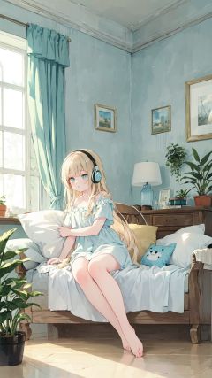 extremely delicate and beautiful, depth of field, amazing, masterpiece, growth, visual impact, ultra-detailed, 1girl, long_hair,Modernist style architecture, window, book, pillow, barefoot, solo, plant, very_long_hair, indoors, potted_plant, headphones, cup, gorgeous, fantasism, nature, refined rendering, original, contour deepening, high-key and low-variance brightness scale, soft light, light and dark interlaced