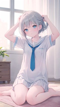 hdr,1girl,young,long_hair,silver_hair,serafuku,white_shirt,arms_up,small_breasts,short_sleeves,solo,hands in hair,Sitting on the carpet,necktie,bare legs,barefoot,clavicle,