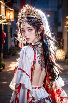 Wide angle lens, masterpiece, top quality, best quality, official art, beauty and aesthetics, bustling streets, festive atmosphere, fireworks, 1 girl, ten thousand family lights, blooming, (Bohemia print top: 1.4), (upper body close-up: 1.2), female focus, detailed portrait photos, looking back,