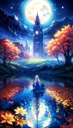 ,1girl with lightblue longhair and blue eyes,(masterpiece:1.5), (illustration:1.5), (beauty:1.5), (perfect details:1.5), (clear background:1.25), (depth of field:0.7), (moonlight:1.5), (long road:1.15), (flower), (life), (autumn), (wind), (red leaves), (dark river), (peaceful mind), (deep thoughts), (reflection), (clear moon), (coolness), (autumn night), (chirping insects), (white steps), (red dewdrops), (parting), (fallen osmanthus flowers), (sorrow), (blowing wind), (yellow leaves), (drunken beauty), (moonlit tower), (clear stream), (transience), (tears), (reflection).1girl with lightblue long hair, hair flowers,hime cut,
