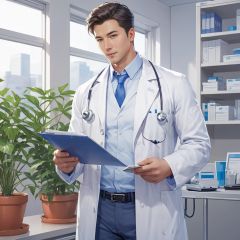 masterpiece, 1 Man, Look at me, Handsome, Short hair, White coat, Doctor., With a report in his hand., Topless, Bulge, Body hair, medical apparatus, Potted plant, Indoor, Brother and noble, Asian male, Big tits, blue shirt, textured skin, super detail, best quality