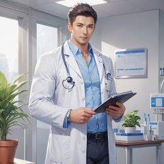 masterpiece, 1 Man, Look at me, Handsome, Short hair, White coat, Doctor., With a report in his hand., Topless, Bulge, Body hair, medical apparatus, Potted plant, Indoor, Brother and noble, Asian male, Big tits, blue shirt, textured skin, super detail, best quality