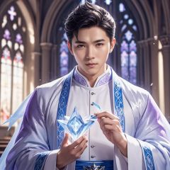 masterpiece, 1 boy, Lovely, Handsome, Father, Church, Light and shadow, Asian boy, Glossy skin, Uncensored, Station, Use dark magic., Ice magic, Blue magic alternates with purple magic., textured skin, super detail, best quality